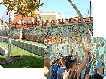 The Sempra Children's Art Wall The Sempra Children's Art Wall runs along the back wall of the amphitheater. A copper-inlaid tree runs along the wall, decorated with hand-painted, circular tile leaves created by more than 1,000 local children. As soon as funding can be secured, brass statues of children at play will be installed on and along the wall. ![]() |
